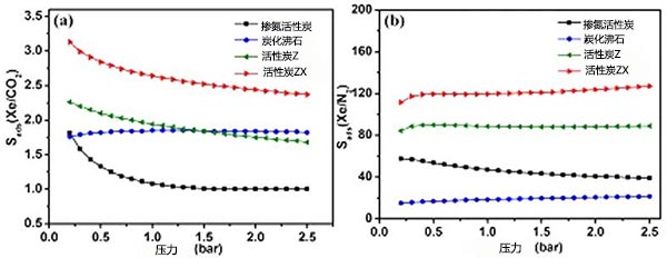 圖4、幾種活性炭樣品吸附選擇性分別為(a)Xe/CO 2,(b)Xe/N 2,摩爾分?jǐn)?shù)y CO2=0.99,y N2=0.99。