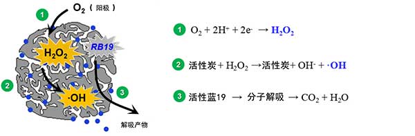 基于該結(jié)果,提出了活性炭電化學(xué)再生的機(jī)制(圖2)。O 2在混合金屬氧化物陽(yáng)極上產(chǎn)生并輸送到陰極附近。陰極,使用由RB19加載活性炭由不銹鋼網(wǎng)緊緊包裹的,電還原Ò 2至過(guò)氧化氫二者上活性炭表面和多孔結(jié)構(gòu)內(nèi)。由于活性炭的催化能力,過(guò)氧化氫的孔隙內(nèi)和表面活性炭被激活,以形成高氧化性O(shè)H,負(fù)責(zé)RB19及其降解中間體的裂解,導(dǎo)致活性炭再生和TOC去除。由于陰極附近的pH增加,孔內(nèi)的RB19也可能從活性炭?jī)?nèi)解吸。