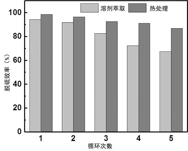 在吸附脫硫中使用的各種方法中,溶劑萃取和熱處理被認(rèn)為是常用的再生方法。在這項(xiàng)實(shí)驗(yàn)中,溶劑萃取和熱處理都用于研究活性炭的再生性能。關(guān)于溶劑萃取方法,在第一次吸附循環(huán)完成后,通過(guò)外部磁體收集活性炭,并通過(guò)添加甲醇作為萃取溶劑進(jìn)行洗滌。然后,將活性炭干燥用于下一次運(yùn)行。如在示出的圖3,它被發(fā)現(xiàn)的活性炭可在前兩次運(yùn)行時(shí)通過(guò)溶劑洗滌輕松再生。這可能是因?yàn)槲锢砦皆谖竭^(guò)程中占主導(dǎo)地位,并且由污染引起的大多數(shù)失活吸附劑可以通過(guò)溶劑萃取方法在初始循環(huán)中再生。然而,在連續(xù)五次再生操作后,吸附劑與新鮮吸附劑保持67%的初始脫硫效率(相當(dāng)于20.22mg DBT/g)。隨著循環(huán)次數(shù)的增加,活性更高的位點(diǎn)與DBT相互作用,并且后一次運(yùn)行留下的活性位點(diǎn)更少,從而導(dǎo)致隨后的再生運(yùn)行中脫硫效率降低。為了提高活性炭吸附劑的再生效果,引入了熱處理方法。通過(guò)溶劑萃取再生后,將獲得的活性炭在氮?dú)夥障略?50℃下活化1小時(shí)來(lái)恢復(fù)活性。