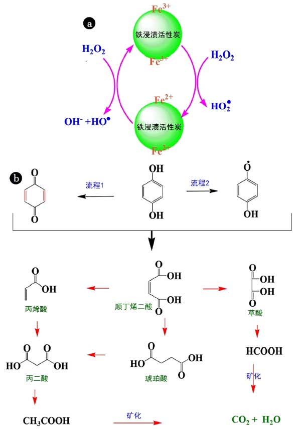 各種類型如羥基(HO•)和過氧羥基(HOO•)自由基的從而起到在苯二酚的氧化重要作用是由各種鐵化合價的氧化-還原反應(yīng)生成的鐵(Fe(III)/Fe的(II))存在于的鐵浸漬活性炭催化劑在過氧化氫的存在下進行。氧化反應(yīng)得到由形成絡(luò)合物開始Fe(III)的-OH基團。代在表示這些基團的機制圖2(a)中。這些自由基氧化苯二酚(ⅰ)吸附在催化劑,(ⅱ)存在于催化劑的附近和(iii)在本體溶液中。的苯二酚氧化機理示于圖2(b)中。苯二酚在其氧化形式各種中間體取決于氧化的階段。它形成的中間體,在此期間被氧化成羧酸,如馬來酸,草酸,丙烯酸,琥珀酸,丙二酸,乙酸和氧化的后面酸氧化的初期階段,例如苯醌和CO 2和H 2 O的充分氧化。