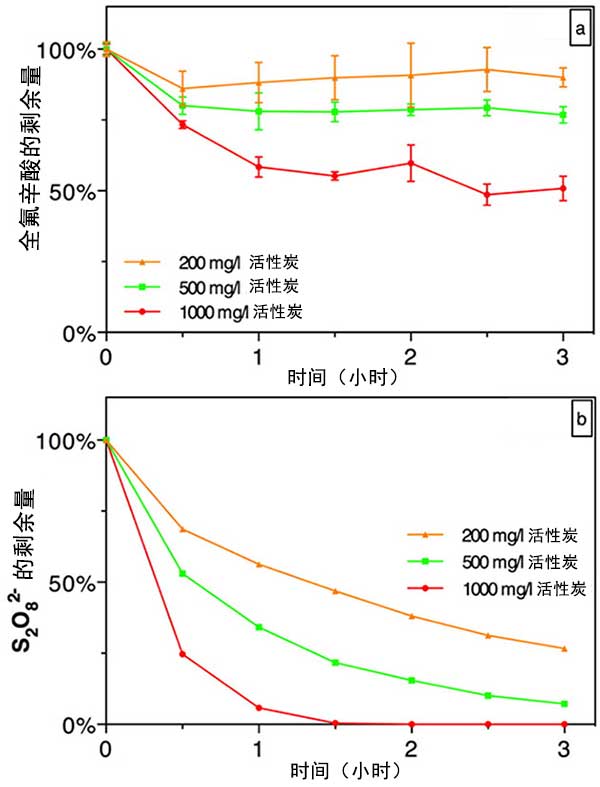 圖2;钚蕴繚舛葘瘜W吸附去除全氟辛酸(圖2a)和過硫酸鹽分解(圖2b)的影響。