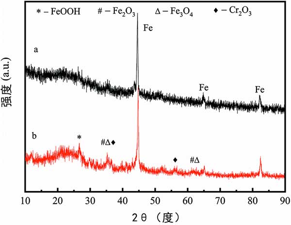 在該研究中,應(yīng)用XRD分析鉻酸鹽溶液處理后的活性炭以揭示其機(jī)制。在與鉻酸鹽溶液反應(yīng)2小時(shí)后,活性炭的XRD圖譜沒有顯著改變(圖4)。然而,與新制備的活性炭相比,可以清楚地檢測(cè)到氧化鐵晶相。XRD結(jié)果表明,而在去除鉻酸鹽期間,活性炭搭載的納米零價(jià)鐵可以被氧化成Fe(ii)和Fe(iii)化合物。
