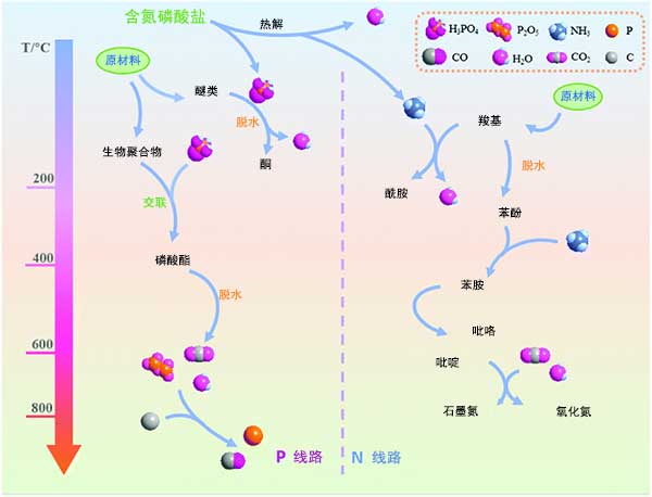 圖1:熱解過程中活性炭原料和含氮磷酸鹽之間可能的反應。