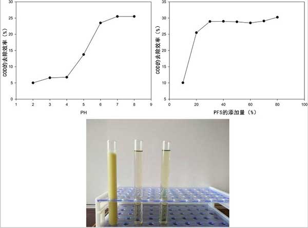 圖3:(a)pH對(duì)COD去除速率的影響,(b)PFS添加對(duì)去除COD的影響,(c)原始溶液與初級(jí)和次級(jí)絮凝后的溶液之間的視覺比較。