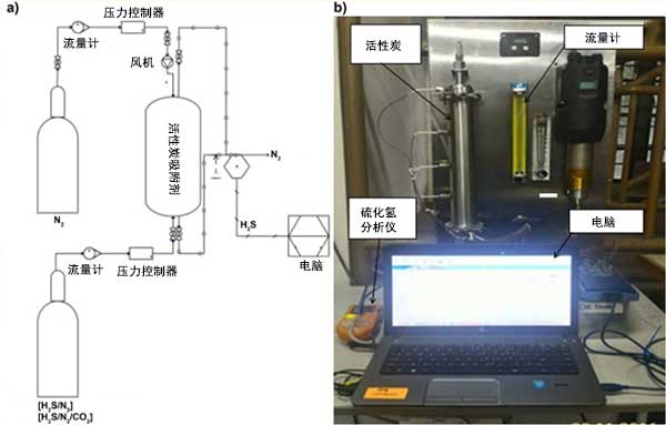 在設(shè)計(jì)為0.3米長的實(shí)驗(yàn)室規(guī)模的單吸附塔單元中檢查六種活性炭對硫化氫的吸附性能。每種活性炭的高度指的是不同的活性炭載荷,分別為0.032kg,0.105kg和0.155kg。通過單次進(jìn)料H 2 S/N 2(1000 ppm H 2 S余量N 2)或H 2 S/N 2/CO 2(1000 ppm H 2)的混合氣體觀察吸附性能。圖1(A)和圖1(B)分別顯示了硫化氫吸附系統(tǒng)的示意圖和實(shí)際照片。