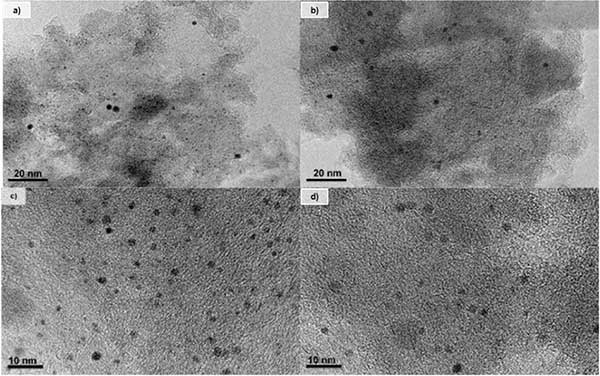 所有活性炭催化劑都顯示出高BET表面積。在二氯甲烷加氫脫氯中使用后沒有觀察到顯著差異,這消除了碳質(zhì)沉積物阻塞多孔結(jié)構(gòu)作為催化劑失活的原因。CO化學(xué)吸附結(jié)果表明,鉑在所有活性炭催化劑中均勻分散,它們之間略有不同。高Pt分散可歸因于活性炭的高表面積及其表面化學(xué)性質(zhì),這在催化劑制備過程中引起活性相與載體之間的相互作用。TEM圖像(圖1)和金屬粒度分布(圖2)證實(shí)了在鉑在兩種不同活性炭中形成Pt納米顆粒,平均尺寸值分別為1.6和2.0nm。