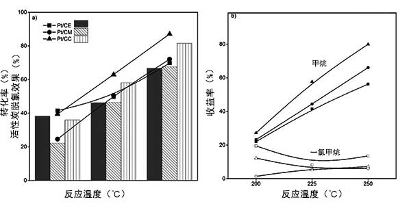 圖3:二氯甲烷(a)的初始轉(zhuǎn)化率和脫氯以及活性炭載鉑催化劑對(duì)甲烷和一氯甲烷(b)的收益率。