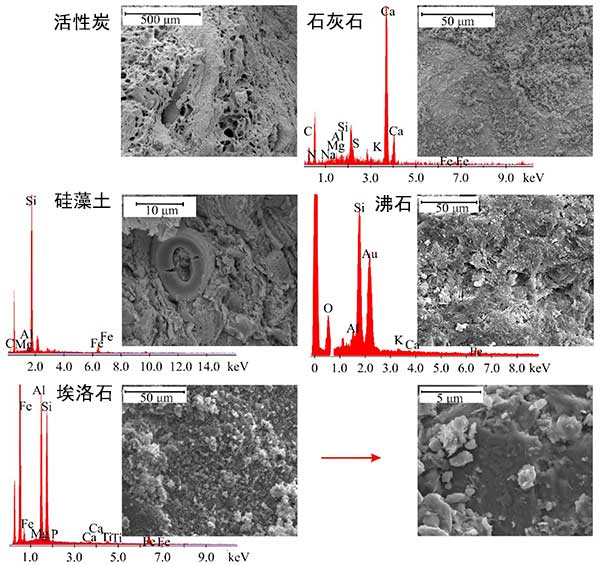 掃描電子顯微鏡(SEM)圖像和反應(yīng)材料的化學微范圍分析(EDS)如圖2所示。值得注意的是,活性炭樣品具有大膨脹的多孔表面,內(nèi)部孔隙的尺寸達到十幾微米到幾百微米。石灰石砂的SEM分析證實了這種材料的碳酸鹽特征,而鈣和氧的微區(qū)化學分析指向方解石(CaCO 3))。SEM-EDS分析表明硅藻土樣品中存在來自二氧化硅基團的礦物,并允許將該材料的巖相分類為硅藻土。SEM微圖像證實了中等發(fā)展的沸石和埃洛石的表面,并且在后一種材料的情況下,存在特征性的納米管,然而,在該放大率下不是非常明顯。此外,EDS光譜指出沸石樣品中存在:硅(Si),氧(O),鋁(Al),鉀(K),鈣(Ca)和鐵(Fe),以及:鐵(Fe) ,埃洛石樣品中的鋁(Al),硅(Si),鎂(Mg),磷(P),鈣(Ca)和鈦(Ti)。