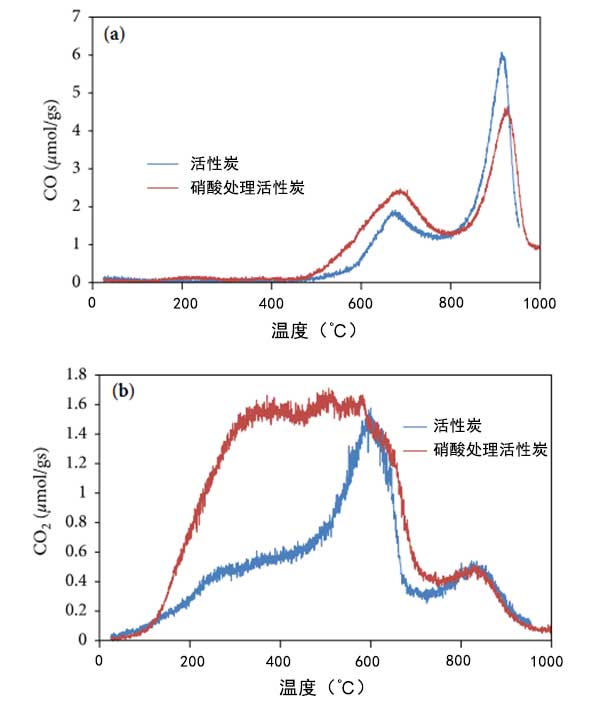 圖1:升溫脫附光譜:(a)CO和(b)CO 2解吸曲線隨活性炭的溫度變化。