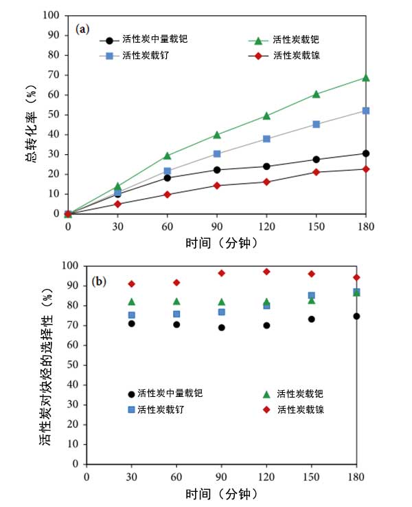 活性炭催化劑對(duì)炔烴的選擇性氫化的催化性能如圖3所示,炔烴總轉(zhuǎn)化率(%)和對(duì)炔烴的選擇性。所有活性炭載金屬催化劑在炔烴的氫化過程中都是活性的,并且對(duì)炔烴(所需產(chǎn)物)具有高選擇性。