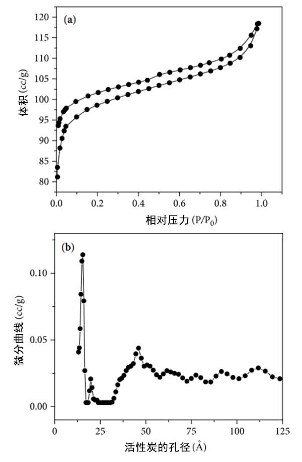 圖2:(a)氮物理吸附等溫線和(b)活性炭載氧化鋅光催化劑的孔徑分布圖。