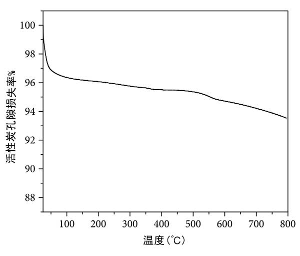 熱重分析:通過使用TGA分析研究了合成催化劑活性炭的熱穩(wěn)定性。發(fā)現(xiàn)催化劑是穩(wěn)定的,并且在450℃的溫度下記錄了約2%的重量損失(圖3),并且可以清楚地看出浸漬降低了碳含量并因此導(dǎo)致孔隙的減少。