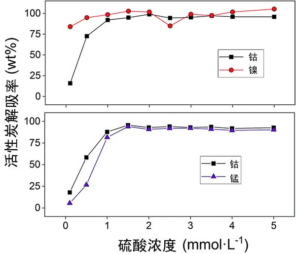 在使用活性炭成功吸附鈷之后,研究了用硫酸汽提以回收金屬離子并允許重復(fù)使用吸附劑。我們分別測試了三種回收參數(shù),實驗發(fā)現(xiàn)低濃度的硫酸就足以去除大部分活性炭吸附的鈷(II),鎳(II)和錳(II)。由于僅有少量鎳(II)被吸附到活性炭上,因此解吸溶液中的鎳(II)濃度也很小。其結(jié)果是,對于鎳(II),元素分析的微小差異導(dǎo)致解吸百分比的相對大的差異,這可以在圖4中看出。