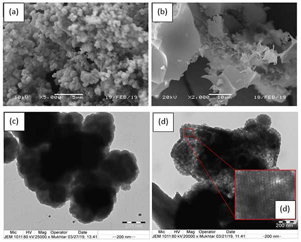 使用SEM,TEM,TGA和XRD分析活性炭的表面形態(tài),熱性質(zhì)和結(jié)晶度。用作活性炭前體的圖像(圖1a,c)顯示其典型的形態(tài)為花椰菜樣結(jié)構(gòu),這種形態(tài)似乎是由于與其中摻雜地嵌入無序聚合鏈形成的。然而,聚吡咯的球形結(jié)構(gòu)通過碳化過程被破壞,導致粗糙,粗糙的表面由不規(guī)則的尖角和剝離狀顆粒組成,在SEM圖像中幾乎沒有孔隙的跡象;钚蕴烤圻量┑腡EM圖像如圖1d所示表示觀察到均勻分布的微孔。此外,TEM圖像描繪了高度豐富和對稱的孔隙,表面積和微孔率的值對應于該活性炭。發(fā)現(xiàn)隨著活化劑用量的增加,表面積增加,孔隙率增加。