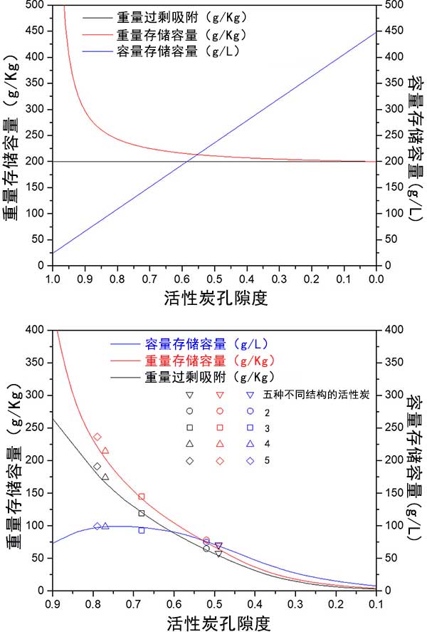 圖4顯示了兩種活性炭的重量和體積存儲容量之間的相互依賴性。實驗吸附測量與第二模型一致,將孔隙率和表面積作為因變量處理。經(jīng)過對比活性炭樣品的實驗性過量吸附,重量儲存容量和體積儲存容量。圖3和圖4將理論模型與實驗數(shù)據(jù)進行比較。它表明,所開發(fā)的模型是通用的,并預測任何活性炭樣品的重量和體積儲存容量之間的相互依賴性。結(jié)果也適用于金屬有機骨架。雖然實驗結(jié)果比較好的活性炭不具有較高的表面積,但孔隙率在0.65和0.75之間。通過使用化學粘合劑將活性炭粉末壓縮成整料,實現(xiàn)了更高的體積儲存容量。整體的體積儲存容量使用整體式整體密度而不是活性炭的表觀密度或金屬有機框架材料的單晶密度來計算。