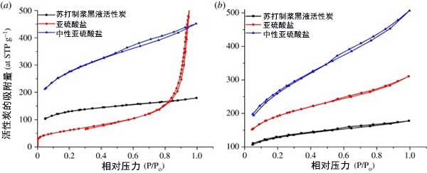 圖1顯示了活性炭在-196℃的氮?dú)馕降葴鼐和孔徑分布及其紋理特征。從看到的圖1中,活性炭的吸附等溫線在很大程度上受到制漿工藝的類型的影響。但是使用蘇打制漿黑液作為前體從活性炭獲得的等溫線遵循I型吸附等溫線。活性炭的氮吸收在非常低的相對壓力下略微增加,隨后在平臺形式中略微吸附增加,相對壓力增加至1,表明存在微孔性。但是,來自亞硫酸鹽的中性亞硫酸鹽制漿的活性炭的等溫線提供了I型和II型的吸附等溫線,這反映在碳結(jié)構(gòu)中存在一些中孔。