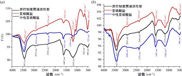 FTIR光譜和SEM在表面功能基團(tuán)并根據(jù)該制漿工藝的研究基于活性炭的形態(tài)學(xué)的變化在圖2示出。關(guān)于FT-IR光譜(圖3a,b),很明顯活性炭的表面具有強(qiáng)帶,其分配為酚木質(zhì)素,羧酸或吸附水的OH伸縮。因?yàn)樘K打制漿導(dǎo)致從原料中更高的二氧化硅去除,并且因此黑液中的二氧化硅含量更高。發(fā)現(xiàn)不同官能團(tuán)為特征的活性炭表面已準(zhǔn)備好進(jìn)行吸附過程。