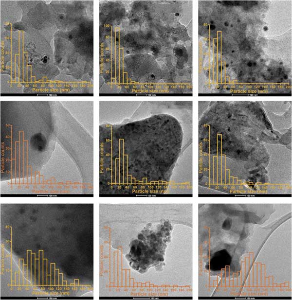 粒徑的變化在許多催化應(yīng)用中是至關(guān)重要的,并且使用硝酸的原理正是為了誘導(dǎo)這些變化。為了通過實(shí)驗(yàn)驗(yàn)證該假設(shè),對于所有九種載銠活性炭催化劑,通過TEM系統(tǒng)地評估Rh納米顆粒的粒度和分布。
