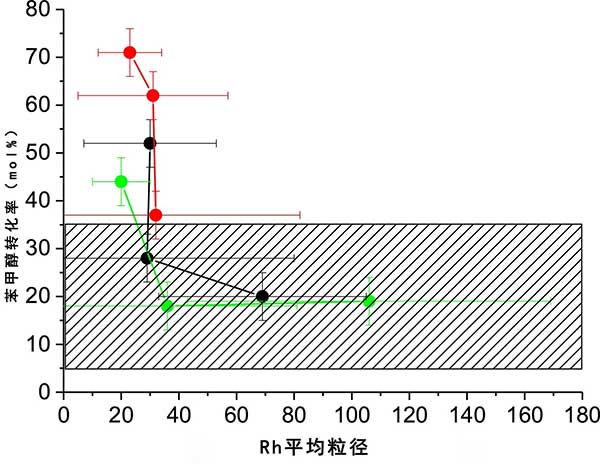 很明顯,這些粒徑范圍非常寬,我們認(rèn)為考慮這樣的大顆粒對氧化反應(yīng)具有活性是不現(xiàn)實(shí)的。在其它術(shù)語中,因子或參數(shù)是該預(yù)治療效果有在銠粒子的大小,但另外一個因素或參數(shù)是在銠粒徑變動的影響對催化活性。圖3值得注意的是,對于高于約的顆粒。30-40nm不再觀察到與催化轉(zhuǎn)化的變化或相關(guān)性,表明粒度不再是活性參數(shù)。我們認(rèn)為該值是銠對芐醇氧化的活性的近似上限直徑,或者反過來對該反應(yīng)有活性要求小于約30納米。我們認(rèn)為這個結(jié)論雖然是一個廣泛的估計(jì),但與未來基于這種金屬的催化劑開發(fā)相關(guān)。