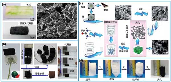 活性炭氣凝膠由納米結(jié)構(gòu)活性炭材料組成,其中孔隙充滿氣體。因?yàn)榭梢越Y(jié)合有益吸附性質(zhì)和高的熱穩(wěn)定性,并且擁有電子傳導(dǎo)性,和可成為催化劑載體,油或有機(jī)溶劑吸附和儲(chǔ)能方面的潛在應(yīng)用;钚蕴繗饽z還有一個(gè)特征是它們的超輕質(zhì)。除了高度多孔和輕質(zhì)之外,另一個(gè)優(yōu)點(diǎn)是在轉(zhuǎn)化成活性炭氣凝膠后引入導(dǎo)電性的可能性,因此允許在電化學(xué)區(qū)域(例如,電池,超級(jí)電容器或?qū)щ姶呋瘎┹d體)中的應(yīng)用。隨著新型活性炭材料的發(fā)展,已經(jīng)生產(chǎn)出具有超低密度和優(yōu)異導(dǎo)電性的石墨烯或基于納米碳管的活性炭氣凝膠作為新興的新型氣凝膠材料,這進(jìn)一步拓展了氣凝膠材料的應(yīng)用領(lǐng)域。除了高級(jí)碳材料能制造氣凝膠外,使用生物質(zhì)做成的活性炭氣凝膠如圖7所示。