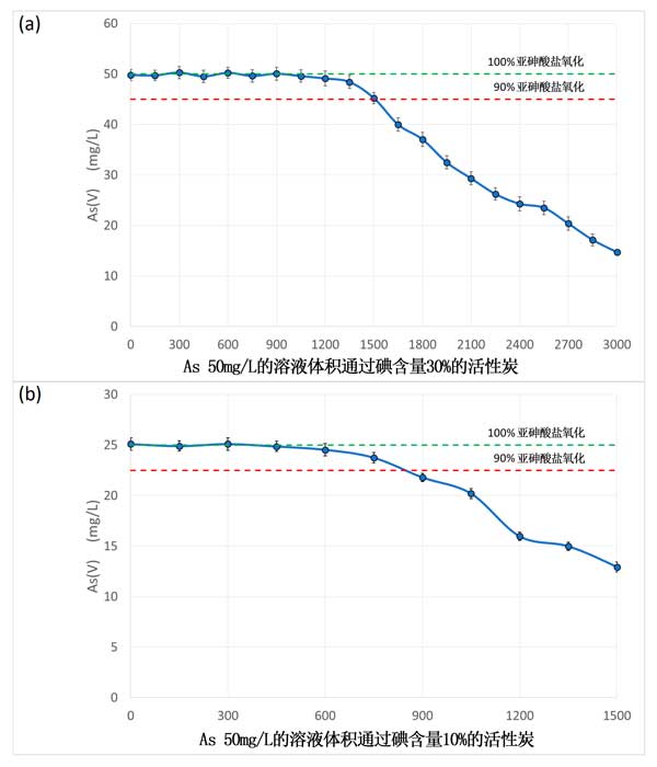 我們的柱實(shí)驗(yàn)可以被認(rèn)為是一種壓力測試,因?yàn)閬喩樗猁}的含量遠(yuǎn)遠(yuǎn)高于天然水中常見的濃度。也使用如此高的濃度以不過度延長實(shí)驗(yàn)時(shí)間。在基于蒸餾水的實(shí)驗(yàn)中,并且使用碘浸漬活性炭,測得砷的氧化效率大于90%直至1.5L被氧化,并且在對于1cc碘浸漬活性炭,氧化能力為約25mg砷。之后,氧化效率逐漸降低,在2.5L左右下降至低于50%(圖3a)。