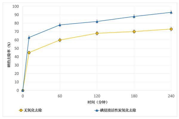 圖4:使用或不使用碘浸漬活性炭時(shí),鐵浸漬活性炭上砷吸附動(dòng)力學(xué)的比較。