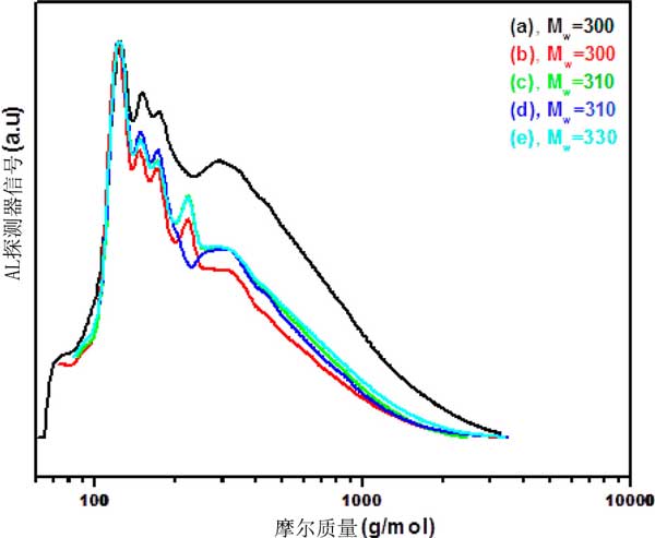 圖2:在400℃下通過各種活性炭載磷化物獲得的木質(zhì)素油的凝膠滲透色譜圖。