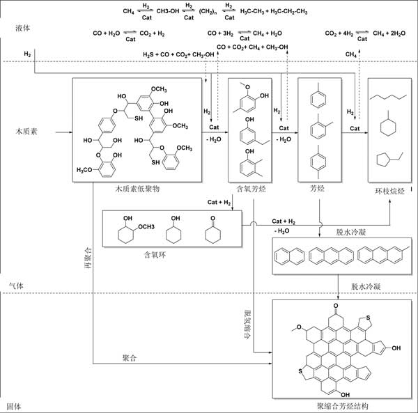 基于木質(zhì)素油的產(chǎn)物產(chǎn)率和組成,提出了一種用于加氫處理的反應(yīng)過程。木質(zhì)素使用活性炭催化劑和氫氣(圖3)。它涉及在液相和氣相中發(fā)生的許多連續(xù)和平行反應(yīng)。對低分子量烷基酚類和芳族化合物的所需反應(yīng)涉及通過裂解鍵來對木質(zhì)素進行熱和催化解聚(加氫裂化)。最具反應(yīng)性的連接是醚鍵,盡管這些在木質(zhì)素中不是很豐富;钚蕴看呋瘎┐龠M解聚反應(yīng),但在不存在活性炭催化劑的情況下的反應(yīng)也產(chǎn)生(有限)量的木質(zhì)素油,表明熱解聚反應(yīng)也起作用。低聚物片段可以進一步解聚成烷基酚類形式的低分子量化合物或再聚合(也與已形成的低分子量化合物一起)成更高濃度的結(jié)構(gòu),最終導(dǎo)致燒焦。后一種途徑可能是熱反應(yīng),因此可以通過使用非;顫姷幕钚蕴看呋瘎﹣硪种疲龃呋瘎┩ㄟ^催化隨后的轉(zhuǎn)化來減少活性中間體的量。中間低分子量烷基酚類在反應(yīng)條件下不是惰性的,并且可以進一步加氫脫氧成芳族化合物和烷烴。