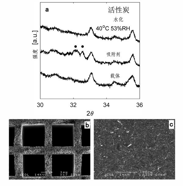 圖1a顯示了在40℃和相對濕度為53%下水合處理后活性炭載體,吸附劑和活性炭X射線衍射圖。由于碳酸鉀倍半水合物的反射特性的存在證實了鹽在載體上的負載。由于載體中加載的鹽量低,解釋了這些反射的低強度,5.58wt%。其余的峰對應于載體中的不同相,例如碳和二氧化硅。圖1b顯示了活性炭載體的SEM照片。如圖中所看到的圖中,信道是正方形幾何形狀的具有每邊1.979±0.006毫米的長度,并且所述通道之間的壁的厚度是0.651±0.022毫米。圖1c示出了通道的內(nèi)壁的表面上,他們看起來很同質(zhì)。