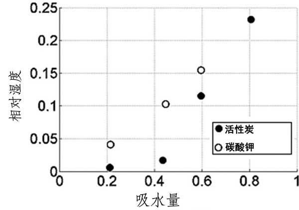 根據(jù)以前的測試結(jié)果,當相對濕度在6至10%的范圍內(nèi)并且其在40%以上潮解時,碳酸鉀在25℃開始水合。如圖2所示活性炭載體和吸附劑在40℃下的水吸附容量;钚蕴枯d體的吸收在相對濕度為60%下急劇增加,在相對濕度為80%下達到最大23%的重量增加。在那里,吸附劑的吸收量幾乎是載體的6倍,并且最重要的是,它遠遠高于理論上形成碳酸鉀倍半水合物所需的量。這種顯著差異的原因是鹽在約相對濕度為43%下潮解,因此所有過量的水在載體材料的孔中冷凝,產(chǎn)生鹽的水溶液。