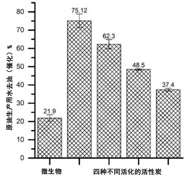 簡(jiǎn)而言之,使用活性炭(60%-93%)和載微生物活性炭(16%-84%)比游離的無活性炭載體的微生物(1%-47%)更好地去除芳香烴。材料的孔隙率和吸附偶極性有利于吸附。常規(guī)活性炭表現(xiàn)出高度的微孔性,其中可以容納分子量約為100的苯,甲苯和苯酚;钚蕴康姆菢O性特征保證了碳?xì)浠衔锏氖杷,也是非極性的;钚蕴筷栯x子表面有利于芳烴保留,因?yàn)榉辑h(huán)中的π電子與表面陽離子靜電連接。使用常規(guī)活性炭和載微生物活性炭的原油去除能力如圖3所示。使用游離的微生物和油-鹽水乳液作為對(duì)照。
