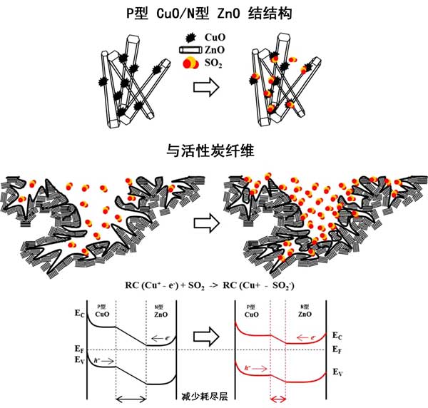 在圖3中,CuO顆粒隨機分散在ZnO花表面上。當CuO顆粒與ZnO花結(jié)合時,在p型CuO顆粒和n型ZnO花之間的界面處形成p/n結(jié)。在這種機制下,電子從n型ZnO轉(zhuǎn)移到p型CuO,并且空穴通過p型CuO到達n型ZnO,直到在系統(tǒng)中建立均勻的費米能級,從而導致能帶在耗盡層彎曲。然而,當CuO-ZnO組合結(jié)構暴露于SO 2時,電子通過Cu +之間的氣敏反應釋放和SO帶負電的2 -離子。還原的SO 2分子與CuO中的孔結(jié)合,從而減少了耗盡層和電阻。這種現(xiàn)象可通過降低電阻來實現(xiàn)良好的SO 2檢測。因此,p型CuO和n型ZnO的傳感響應的貢獻代表了傳感器的主要特性,而活性炭纖維的比表面積在SO 2傳感特性中起著重要的作用。