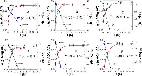 圖1顯示了典型的動(dòng)力學(xué)圖,說(shuō)明了沒(méi)食子酸和沒(méi)食子酸丙酯在平衡(q)時(shí)每質(zhì)量活性炭吸附的抗氧化劑的量隨時(shí)間的變化。還顯示了在不同溫度下至少三個(gè)半衰期(相關(guān)系數(shù)>0.99)的相應(yīng)一階圖。在所有情況下,吸附曲線均顯示在4h后達(dá)到平衡,并至少維持24h,這是后續(xù)研究的時(shí)間。