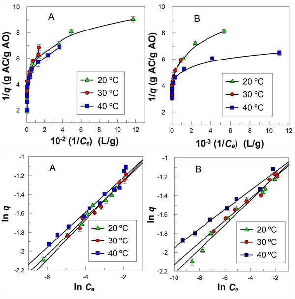 在不同的活性炭量下,評(píng)估了溫度(T=20–40°C)對(duì)沒(méi)食子酸和沒(méi)食子酸丙酯吸附過(guò)程的影響。實(shí)驗(yàn)吸附平衡數(shù)據(jù)擬合到兩個(gè)等溫線模型,Langmuir和Freundlich方程,并評(píng)估了擬合優(yōu)度。圖2。在研究的交流范圍內(nèi)獲得了非線性圖。因此,結(jié)果表明該模型不適用于描述沒(méi)食子酸和沒(méi)食子酸丙酯在活性炭上的吸附。注意,在任何給定的活性炭質(zhì)量下,溫度的變化都會(huì)導(dǎo)致沒(méi)食子酸和沒(méi)食子酸丙酯的吸附能力發(fā)生非常小的變化,差異小于2%。