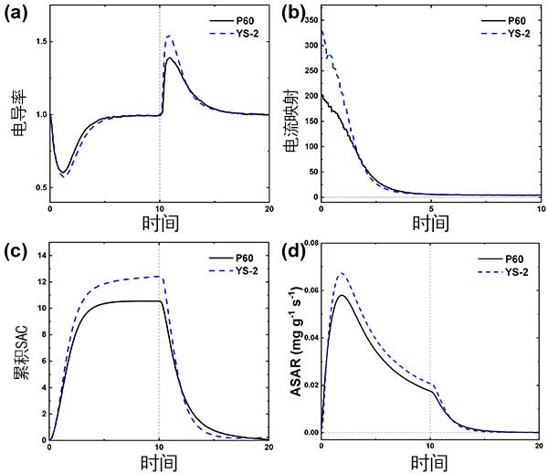圖2以(a)歸一化電導(dǎo)率曲線表示使用疏水和親水活性炭電極的電容去離子性能。如圖2a所示,在充電步驟期間,與疏水活性炭電極相比,歸一化電導(dǎo)率在親水活性炭電極的情況下顯示出更低和更寬的下降。對于親水活性炭電極,在充電步驟開始時,圖2b中所示的特定電流也顯得較高。圖2的a,b在電容去離子表明更多離子在充電步驟中的初始幾分鐘吸附在親水活性炭電極的表面上。這意味著在親水活性炭電極上可以更快,更高地吸附鹽?梢酝茢,由于水分子更容易進(jìn)入微孔,因此親水活性炭電極上離子的可及表面積大于疏水活性炭電極上的離子的可及表面積。