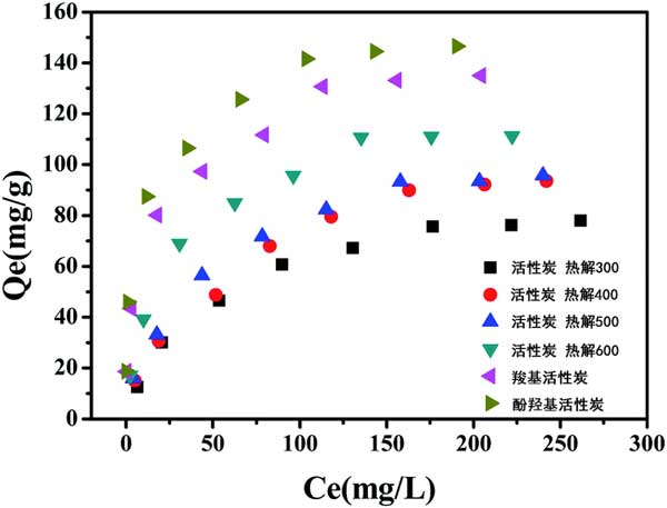 大量研究表明,有機污染物在水介質(zhì)上的吸附包括分配和吸附作用。為了評估在活性炭上吸附化合物時在碳化相中的吸附和在非碳化相中的分配的貢獻,雙模式模型在該研究領(lǐng)域中被成功引用。通過雙模式模型計算了多菌靈在不同濃度的活性炭上的分配和吸附。在該實驗中,雙模型為所有樣品的等溫線提供了良好的擬合(圖3)。在本研究中,所有活性炭上多菌靈的吸附均大于分配所有多菌靈濃度的吸附。但是,隨著多菌靈濃度的增加,分配(Q p)和吸附(Q ad)對總吸附的貢獻也不同。在低濃度范圍內(nèi),吸附大于在活性炭上的分配,并且Q ad值貢獻超過總吸附的97%。但是,在高濃度范圍內(nèi),多菌靈對不同樣品在整體吸附中的分配和吸附的貢獻不同。當多菌靈的濃度達到300 mg L-1時在熱解300、400、500攝氏度的活性炭上,吸附對總吸附的貢獻仍然遠遠大于分配作用。盡管活性炭中含O官能團的含量逐漸減少,但分配對總吸附的貢獻率卻逐漸增加,特別是對于羧基活性炭和酚羥基活性炭,它們的Q p值分別達到39.4%和44.13%。主要原因可能是樣品表面上含O官能團的減少導(dǎo)致更好地暴露于樣品表面和多菌靈濃度增加,從而導(dǎo)致吸附過程飽和。因此,多菌靈可以分配給非碳化相。