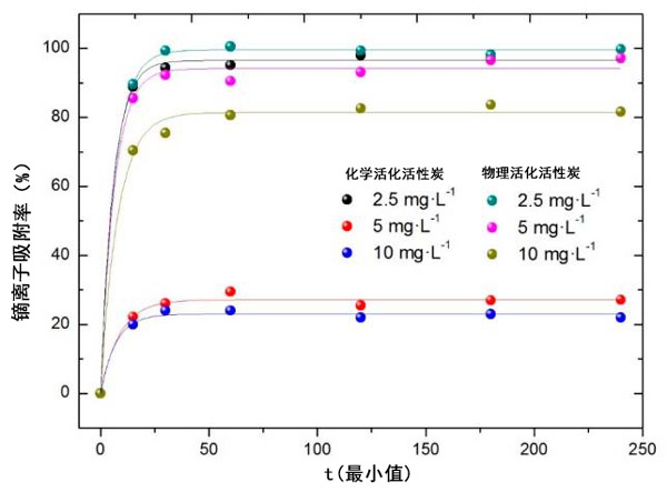 吸附實(shí)驗(yàn)表明,溶液pH的變化對(duì)活性炭的吸附有很大影響,在pH為4時(shí)獲得較大的吸附。如預(yù)期的那樣,溶液鏑濃度的降低會(huì)增加吸附百分比。另外,在化學(xué)活性炭的情況下,鏑吸收量隨著吸附劑量的增加而逐漸增加。在物理活性炭的情況下,沒(méi)有觀察到這種效果,其中除了使用的最低量外,吸附百分比實(shí)際上保持恒定。最后,溫度的變化稍微改善了吸附過(guò)程。盡管如此,物理活性炭在所有情況下都表現(xiàn)出很強(qiáng)的吸附能力。