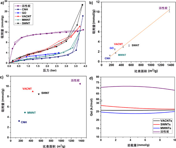 圖1顯示了不同吸附劑的示意圖。活性炭具有無序的孔結(jié)構(gòu)(圖1a),其孔隙度是由基本結(jié)構(gòu)單元的無規(guī)堆積引起的,該結(jié)構(gòu)單元可能是小于10-20環(huán)的平面芳族結(jié)構(gòu),分布在2-4層上或有缺陷的微石墨烯層。具有這種形態(tài),它代表具有擴(kuò)展的結(jié)構(gòu)紊亂的類型學(xué)碳吸附劑。氧化石墨烯具有2D分層結(jié)構(gòu),如圖1b所示。合成氧化石墨烯的起始材料是石墨,石墨的氧化引入了氧官能團(tuán),繼而增加了層間距并使材料變成親水性。隨后的剝落步驟將各層分開,從而顯著增加其可訪問的表面積,從而導(dǎo)致單層或少層氧化石墨烯的形成。在我們以前的工作中,通過XPS分析,我們發(fā)現(xiàn)氧化石墨烯上存在的氧官能團(tuán)是羥基和羧基的形式。材料在孔隙率和功能化程度方面的可調(diào)性使氧化石墨烯成為親水性碳吸附劑的原型,因此對于研究2D材料中的氣體吸附也很有趣。碳納米角具有管狀結(jié)構(gòu),在一端具有封閉的錐形尖端結(jié)構(gòu)(圖1c)。單個碳納米角通常為單壁,內(nèi)徑為2-4 nm。碳納米角的獨(dú)特特征是直徑為50–100 nm的剛性球形聚集結(jié)構(gòu)。合成后的碳納米角關(guān)閉,氣體分子無法進(jìn)入碳納米角內(nèi)部。氧化處理,例如在空氣中加熱,O 2 或CO 2用于打開碳納米角,從而將可及表面積增加3-4倍。碳納米角具有微孔的組合,對于氣體吸附應(yīng)用很有趣,因?yàn)樗鼈兛梢源罅可a(chǎn)且純度高。