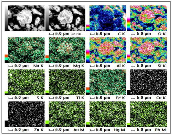 SEM-EDS測(cè)試使用了三個(gè)樣本,即A區(qū)域樣本,B區(qū)域樣本和原始土壤樣本。分析了這三個(gè)樣品。尋找的參數(shù)是充當(dāng)污染物的重金屬元素。該測(cè)試的結(jié)果顯示了土壤中存在的元素的質(zhì)量百分比。掃描電鏡是一種用于表面觀察的工具,其焦點(diǎn)深度大于光學(xué)顯微鏡,可以直接觀察復(fù)雜的表面而無(wú)需復(fù)制。SEM圖像顯示出樣品的形態(tài)狀態(tài),顯示出大小不規(guī)則的團(tuán)塊。同時(shí),EDS分析非常適合揭示樣品中的化學(xué)元素和化合物。EDS的元素映射將為對(duì)象表面上的每個(gè)元素賦予不同的顏色,并定量分析每個(gè)元素的百分比。