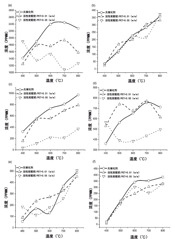 圖1:在有和沒有活性炭載鈀催化劑的條件下,聚對苯二甲酸乙二醇酯(PET)的熱解得到的聯(lián)苯衍生物濃度的類型。(a)2-萘甲酸,(b)芴酮,(c)三亞苯基,(d)聯(lián)苯基-4-羧酸,(e) -三苯基和(f)鄰-三苯基。