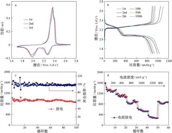 為了評估活性炭作為陰極的電化學(xué)性能,將鋰箔作為陽極組裝到鋰硫電池的紐扣電池中。用于第一,第二和第三個循環(huán)的循環(huán)伏安圖(CV)曲線上在0.05毫伏·秒的掃描速率的電位窗口進行(圖2A)。在第一循環(huán)期間,觀察到兩個陰極峰在2.26和1.97 V,CV曲線中最初的幾個循環(huán)幾乎重疊,這表明循環(huán)穩(wěn)定性極佳,容量保持率相對較高;钚蕴康暮汶娏鞒潆/放電曲線和循環(huán)穩(wěn)定性的測試中,如在圖中所描述2B、C;钚蕴侩姌O的首次放電容量為1045 mAh·g -1,約為硫理論容量的62.5%。此外,活性炭電極在第100次循環(huán)時也顯示出869.8mAh·g -1的放電容量。如圖2d所示測量活性炭的倍率性能,在200–3200 mA·g -1下表現(xiàn)出1260、1050、806、513、290 mAh·g -1的可逆放電容量。此外,當(dāng)電流密度達到800 mA·g時,活性炭陰極的放電容量為802 mAh·g -1。多孔活性炭材料表現(xiàn)出中等的鋰硫電池電化學(xué)性能,顯示出高性能鋰硫電池的潛力。