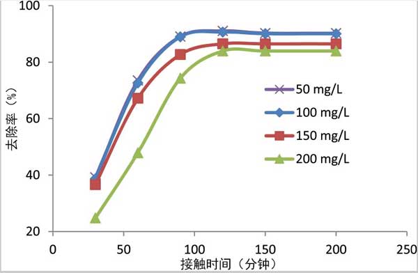 進(jìn)行了兩組實(shí)驗(yàn)以研究苯酚在活性炭負(fù)載納米銀吸附劑上的吸附。進(jìn)行了一組實(shí)驗(yàn)以研究苯酚的初始濃度和接觸時(shí)間對(duì)活性炭負(fù)載納米銀吸附劑對(duì)苯酚吸收的影響。這是通過(guò)改變初始濃度(50–200mg/L)和接觸時(shí)間(30–200min),同時(shí)分別將吸附劑量和攪拌固定在0.2g和200rpm上來(lái)實(shí)現(xiàn)的。另一組實(shí)驗(yàn),用來(lái)確定活性炭吸附劑的最大程度吸收苯酚的工藝參數(shù)。在這里,選擇的因素包括初始苯酚濃度,接觸時(shí)間,吸附劑劑量和攪拌速率等。