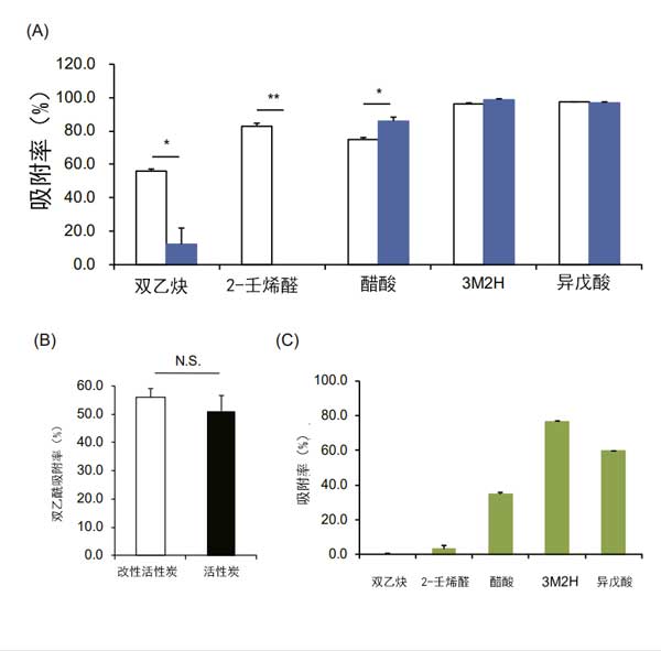 圖3:活性炭對(duì)產(chǎn)生異味的揮發(fā)性有機(jī)化合物的吸附能力。(A)改性活性炭和氧化鋅的吸附水平。(B)使用相同含量的活性炭和改性活性炭,比較改性活性炭和活性炭的二乙;剿健(C)二氧化鈦對(duì)各種VOC的吸附水平。