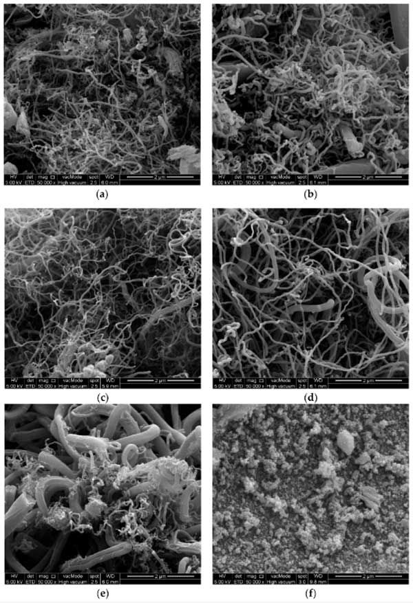 用FESEM技術(shù)分析了合成樣品的形態(tài)特征。圖2a-f顯示了放大的50,000倍的六個(gè)選定活性炭樣品圖像。圖2c顯示了活性炭5的FESM圖像,通過(guò)使用5%的鐵作為單催化劑和40分鐘的反應(yīng)時(shí)間,發(fā)現(xiàn)炭產(chǎn)率和接觸角較高。在此樣本中發(fā)現(xiàn)了兩種類型的碳納米材料,分別是碳納米纖維和多壁碳納米管。圖2f顯示了活性炭3的FESEM圖像,該圖像是通過(guò)使用4%的鈷作為單催化劑和40分鐘的反應(yīng)時(shí)間制備的。發(fā)現(xiàn)僅使用大量的鈷作為催化劑產(chǎn)生非常差的炭產(chǎn)率,這表明材料制備得不怎么好。圖2e顯示了活性炭4的FESEM圖像,該圖像是通過(guò)使用5%的鐵和4%的鈷作為雙金屬催化劑制備的,反應(yīng)時(shí)間為40分鐘。該圖像表明,使用大量的鈷和鐵時(shí),主要生成聚集的炭納米材料和碳納米纖維,因?yàn)檫@樣的實(shí)驗(yàn)條件不是優(yōu)選的。