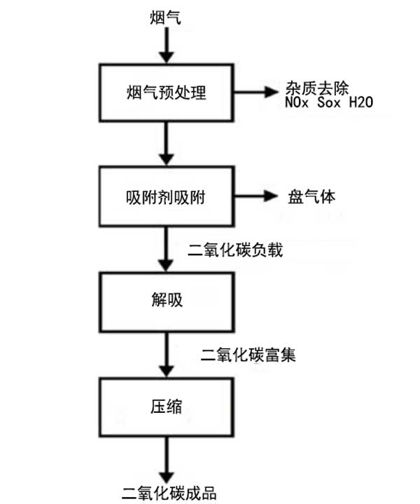 二氧化碳的吸附技術的簡化圖在圖二顯示。首先將煙氣中的水分,硫和氮氧化物凈化。然后,所制備的氣體進入使用固態(tài)吸附劑的吸附階段,例如活性炭,沸石,金屬有機骨架,多孔聚合物,基于堿金屬和胺的碳酸鹽的固體材料,碳球等。之后,吸附劑進入解吸階段,在此階段釋放出富含CO2的氣體混合物,然后在壓力下將其壓縮。該技術的優(yōu)點是二氧化碳萃取效率高,再生成本低以及吸附劑操作的穩(wěn)定性;钚蕴繉O2和N2的吸附能力很高,具有不同于沸石的大比表面積,并且還可以在潮濕條件下工作。而且,活性炭比沸石具有更低的吸附熱,因此它們可以更容易地再生。因此,在25°C和1bar的溫度下,活性炭的吸附熱為3kJ,而沸石為30kJ。收集二氧化碳的吸附劑質(zhì)量的重要指標之一是二氧化碳的吸附量;旧,在靜態(tài)條件下和動態(tài)條件下都進行吸附容量的研究。