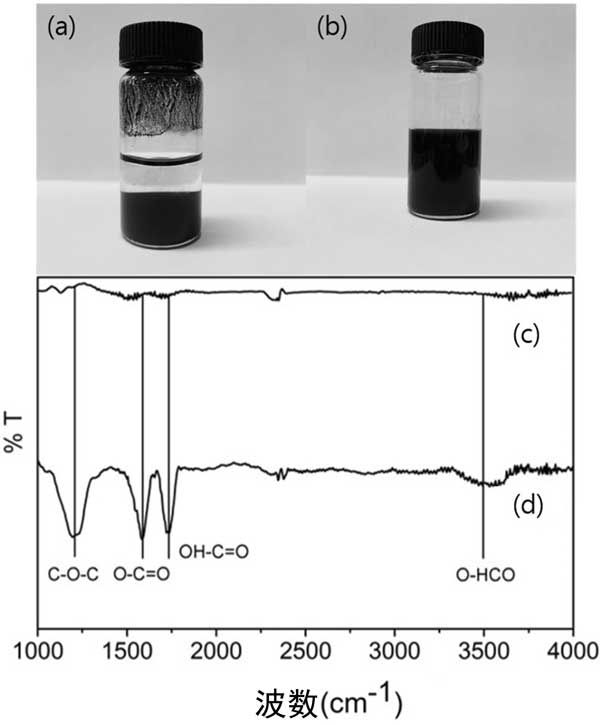 圖2:活性炭和官能活性炭分散體與超聲處理1個(gè)小時(shí)。的FT-IR光譜Ç活性炭和d官能活性炭。