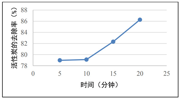 吸附時(shí)間測(cè)試:將豆腐廢液行業(yè)樣品溶液制備到四個(gè)燒杯中。在每杯中加入多達(dá)0.5克的椰殼活性炭。攪拌下靜置5分鐘,10分鐘,15分鐘,20分鐘。之后,用移液管吸取10mL溶液,然后將其放入試管中。加入0.4mL苯酚溶液,0.4mL硝普鈉,1mL氧化溶液。放置1小時(shí)以產(chǎn)生顏色。形成顏色后,使用濾紙將活性炭與樣品溶液分離。倒入比色杯,使用分光光度計(jì)對(duì)其進(jìn)行分析,讀取并記錄其在640nm波長(zhǎng)處的吸收。時(shí)間變化的吸附用K2CO3活性炭和HCl活性炭進(jìn)行兩次。