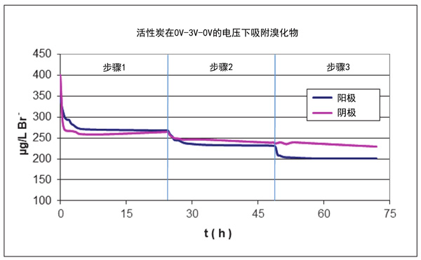 圖4:在三步實驗中的溴化物濃度,第二步對應(yīng)于在3V下進行24h的陽極和陰極電吸附實驗。在第二步中施加3V電壓24h,然后將其再次置于開路狀態(tài)24h。