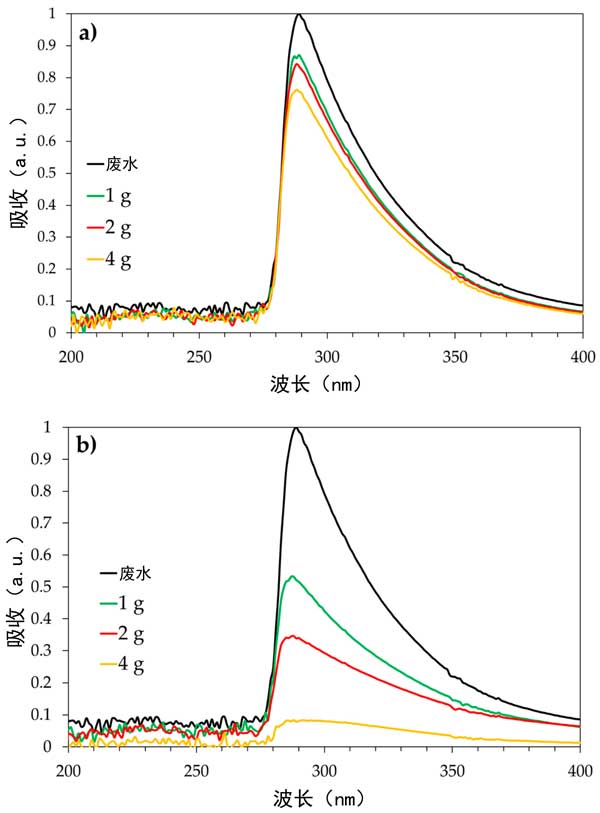圖3:生物炭樣品(a)和活性炭樣品(b)的洗滌塔廢水的UV-Vis曲線與碳量的關系。