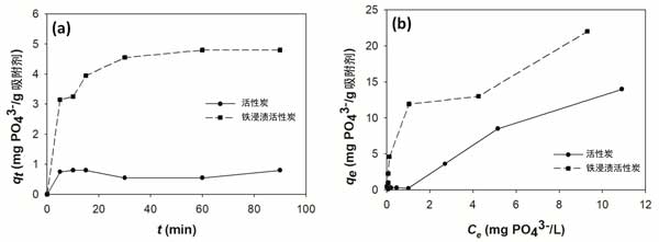 圖3:(a)磷酸鹽在活性炭和浸漬活性炭上的吸附動力學(xué),以及(b)對磷酸鹽的吸附等溫線。